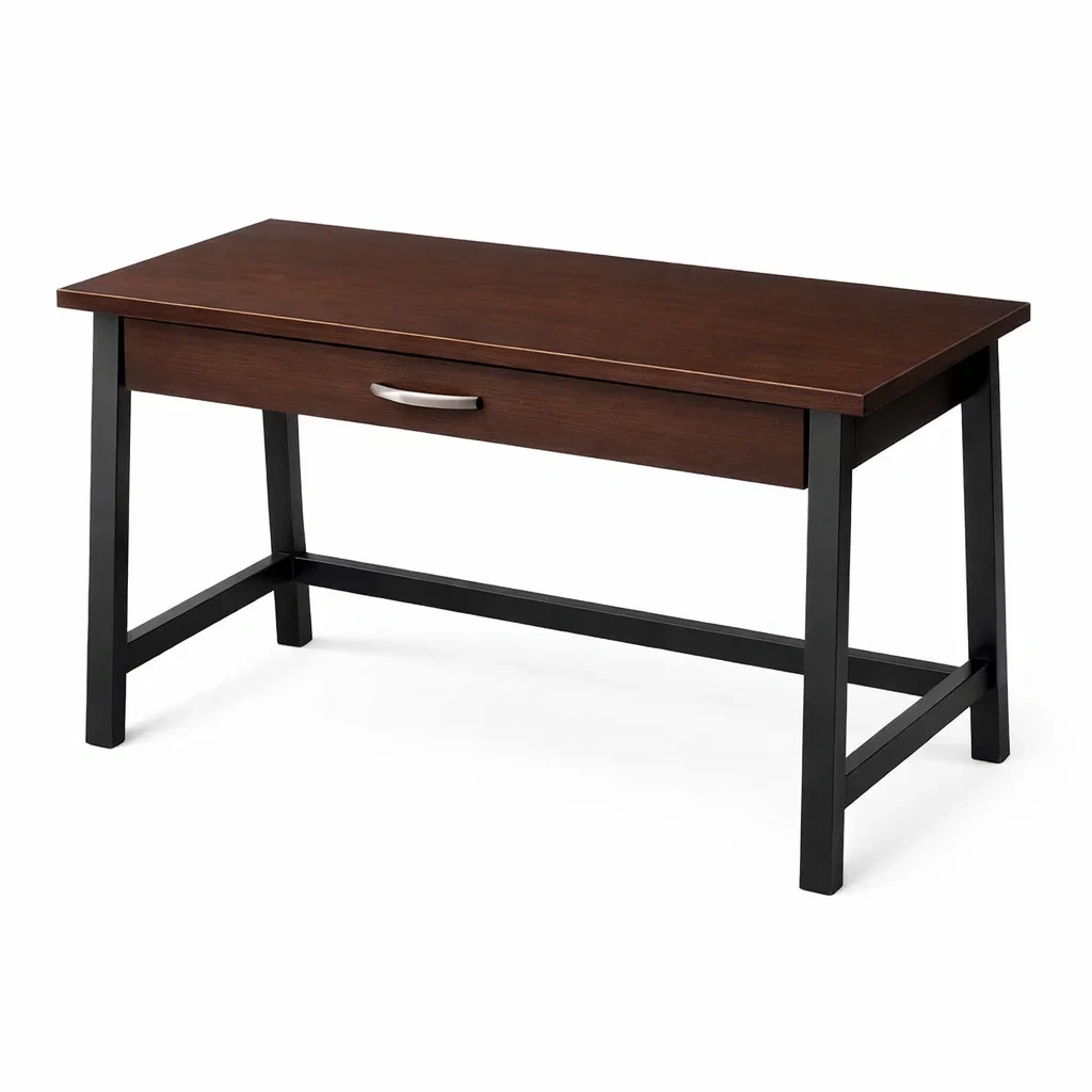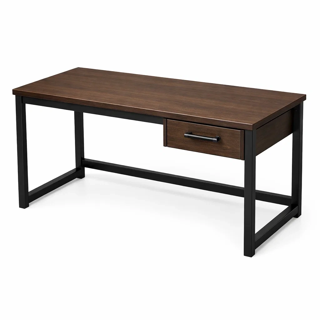 Schreibtisch holztisch dunkelbraun mit metallrahmen und schublade